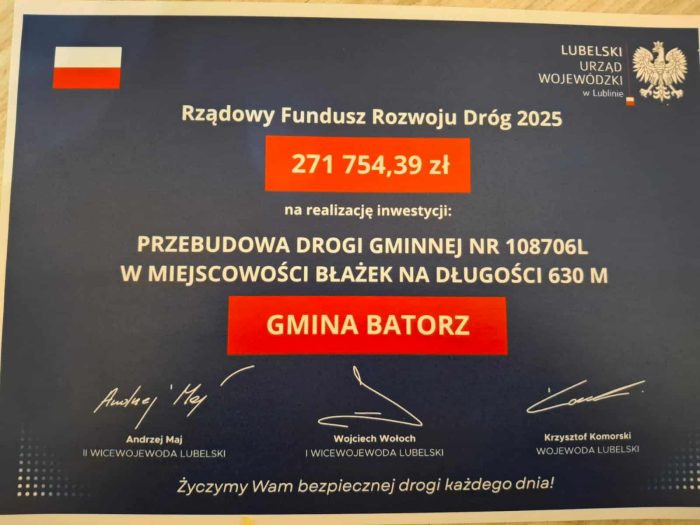 W dniu 15 października br. umowę w tej sprawie podpisali Krzysztof Komorski – Wojewoda Lubelski, Wójt Gminy Batorz Krzysztof Baran oraz Skarbnik Gminy Barbara Ciołek.